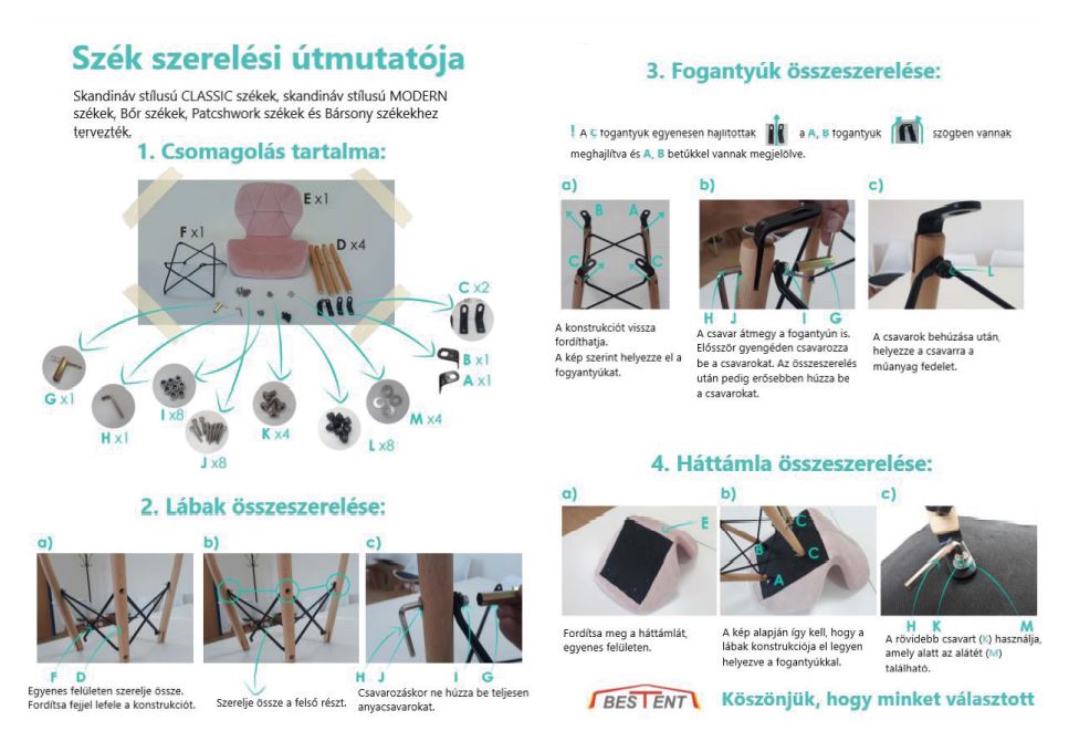 Részletes útmutatót készítettünk Önnek a vasszerkezetű székek összeszereléséhez. Reméljük, hogy a fotódokumentáció segítségével a székek összecsukása gyerekjáték lesz. Az útmutatót a következő kategóriák termékeihez használhatja: